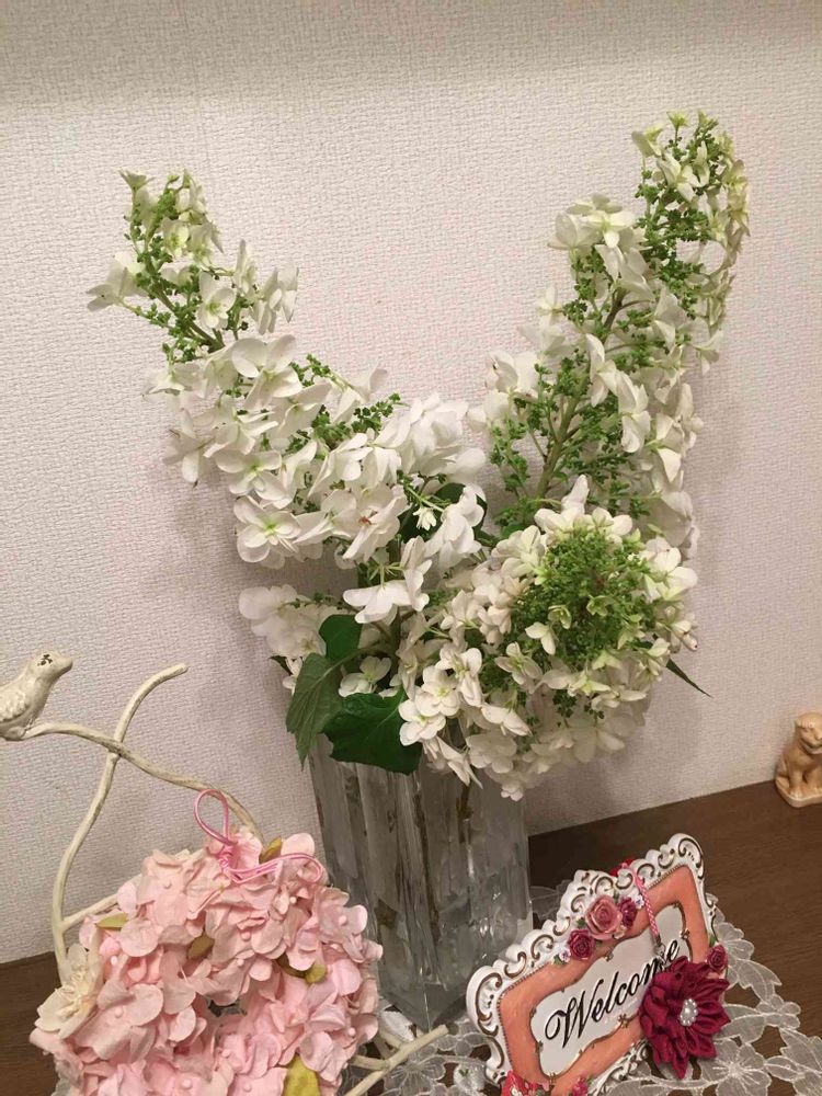 お庭のカシワバアジサイ、雨で枝が折れたので、花瓶に。形がまとまらない(T . T)