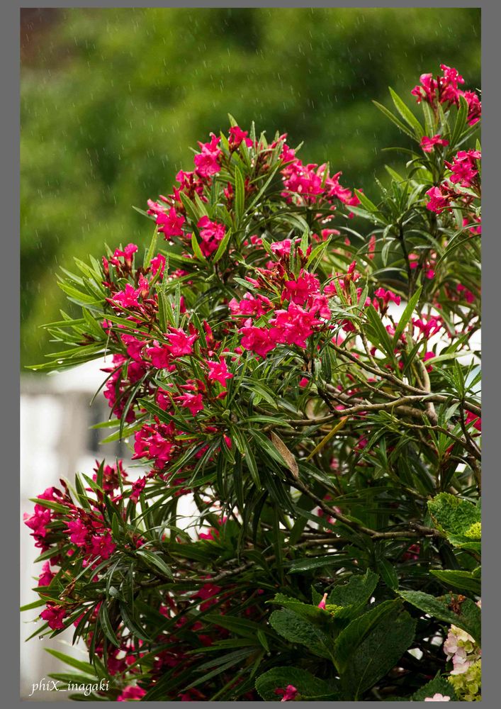小雨の中,枇杷島の街を写真散歩。画面には細かい雨粒が写っています。濃い赤い花を咲かせるこの樹が名前が分かりませんでした。どなたか,ご存じでしたらアドバイスをお願いします。キョウチクトウの様にも見えますが,ちがうかなあ,と思います。