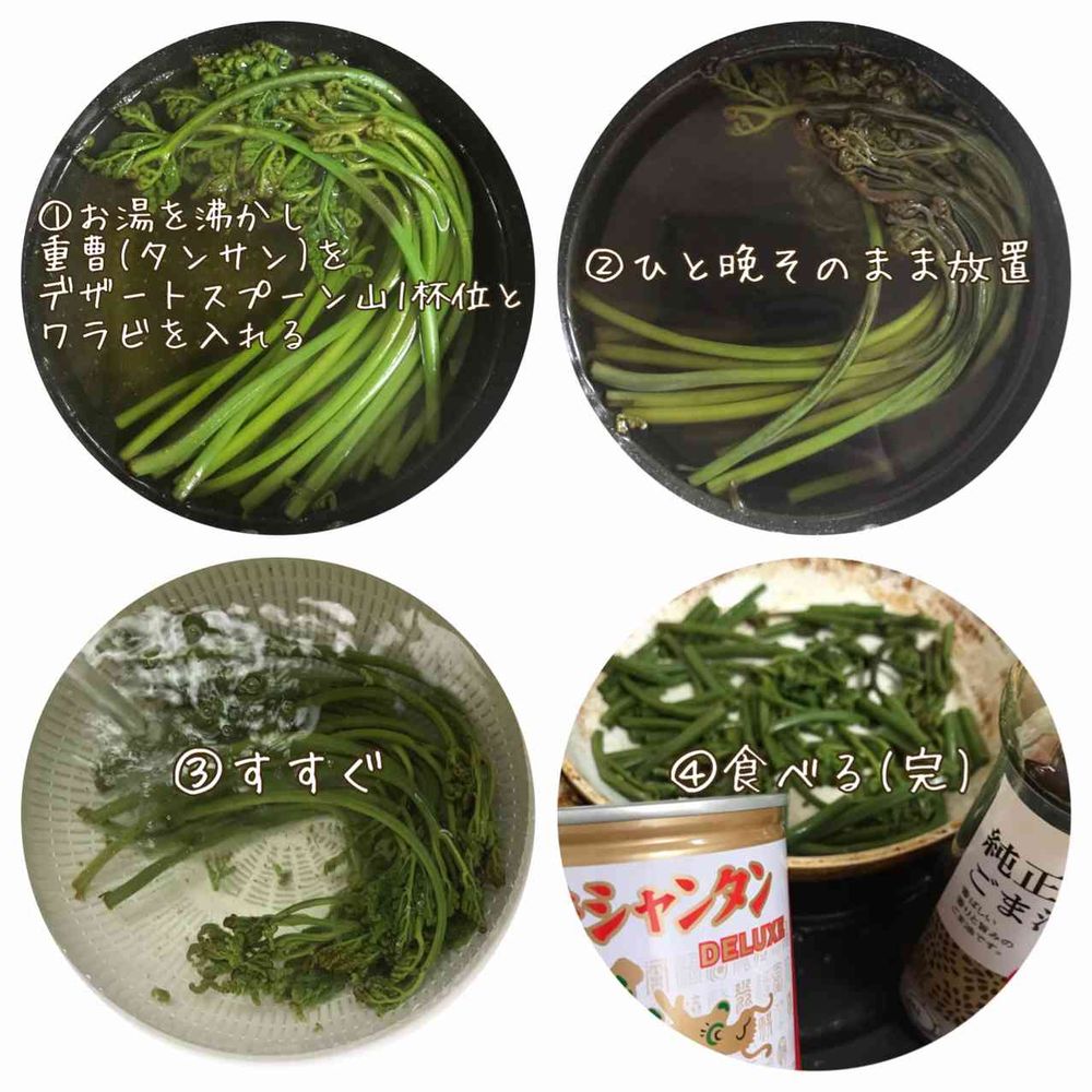 それで沸騰したお湯に重曹を少し入れてそこへワラビを入れ2時間位そのままにしてその後引き上げると緑色が残ったままでアクが抜けていました😄参考まで。