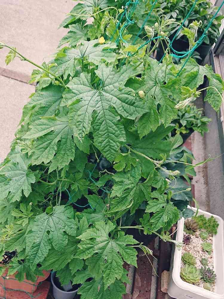 このまま緑のカーテンに日を遮ってもらって、多肉ちゃんたちに涼を与えてくれるといいな。