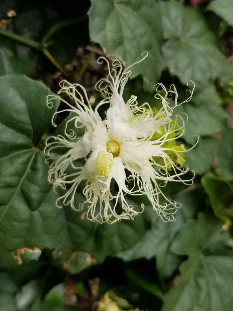夜蕾が開いて花が咲くそうです カラスウリはオレンジというか赤い実がなりますが こちらの実は 黄色 種は黒いブリーフに似てるそうです😁