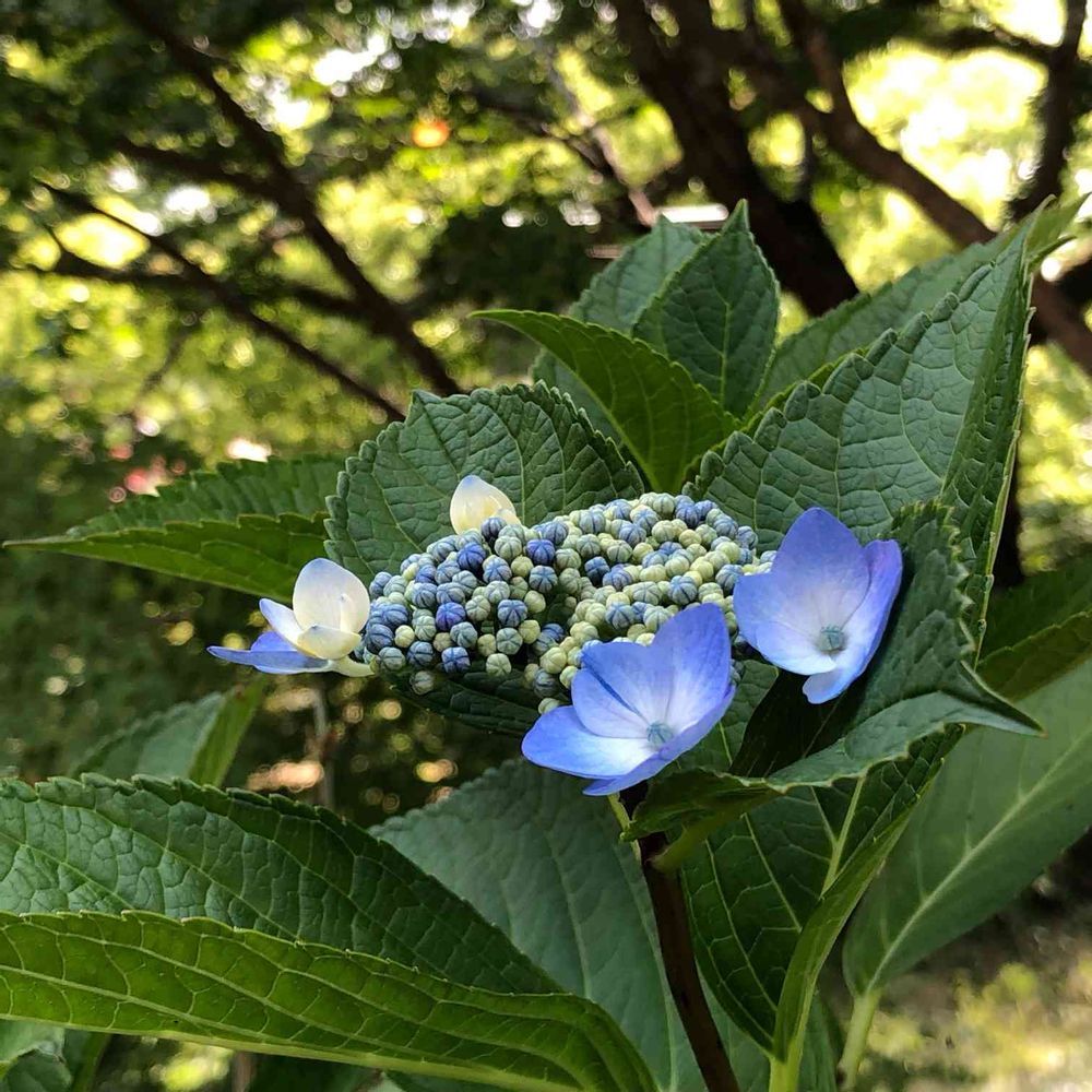額がネモフィラの花のようなアジサイ、力強い葉っぱに守られて咲いてます!🌿