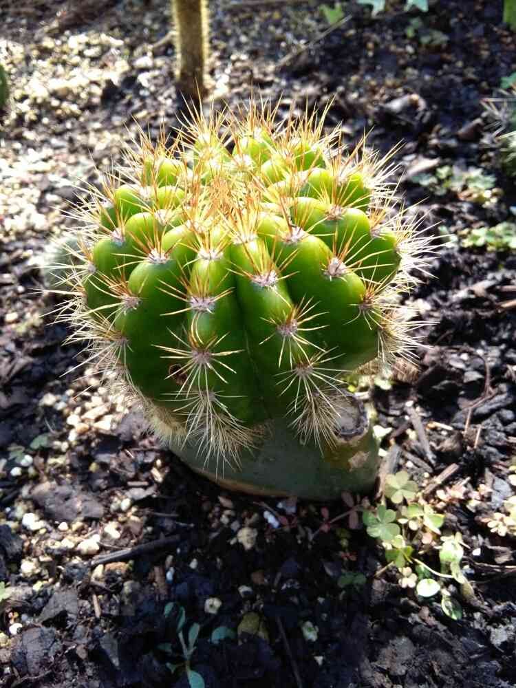 団扇サボテンに接ぎ木した地植えの金盛丸です。さすが接ぎ木の威力は凄く接ぎ木してワンシーズンで3倍は成長しました。刺も通常の金盛丸とは全く印象が違います。
