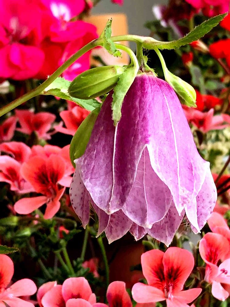 昨年出会った二重咲きのホタルブクロ。やっと咲きました😆蕾が3つもあります。園芸店で見つけた時は、本当に小さくて大丈夫と心配したものです。咲き終えたら、地植えにしたいと思います。背景の朱色の花は、ペラルゴニウムです。
