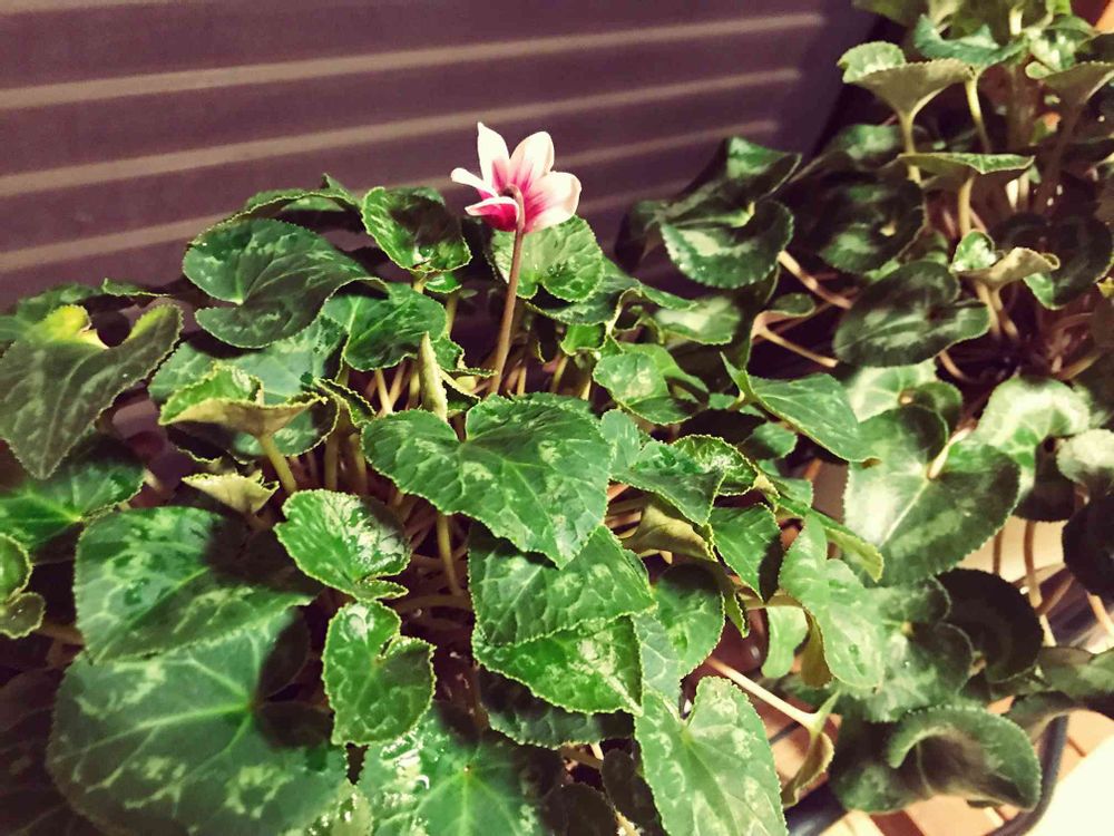 夏越しに挑戦中のシクラメンが花を咲かせた。