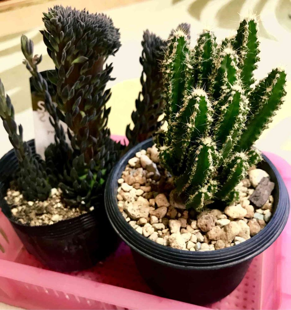 心臓の定検の帰りに寄った花木センターで、ゲットした2鉢。右はシノクラッスラ・スマロの綴化。左は名前聞き忘れたサボテン。