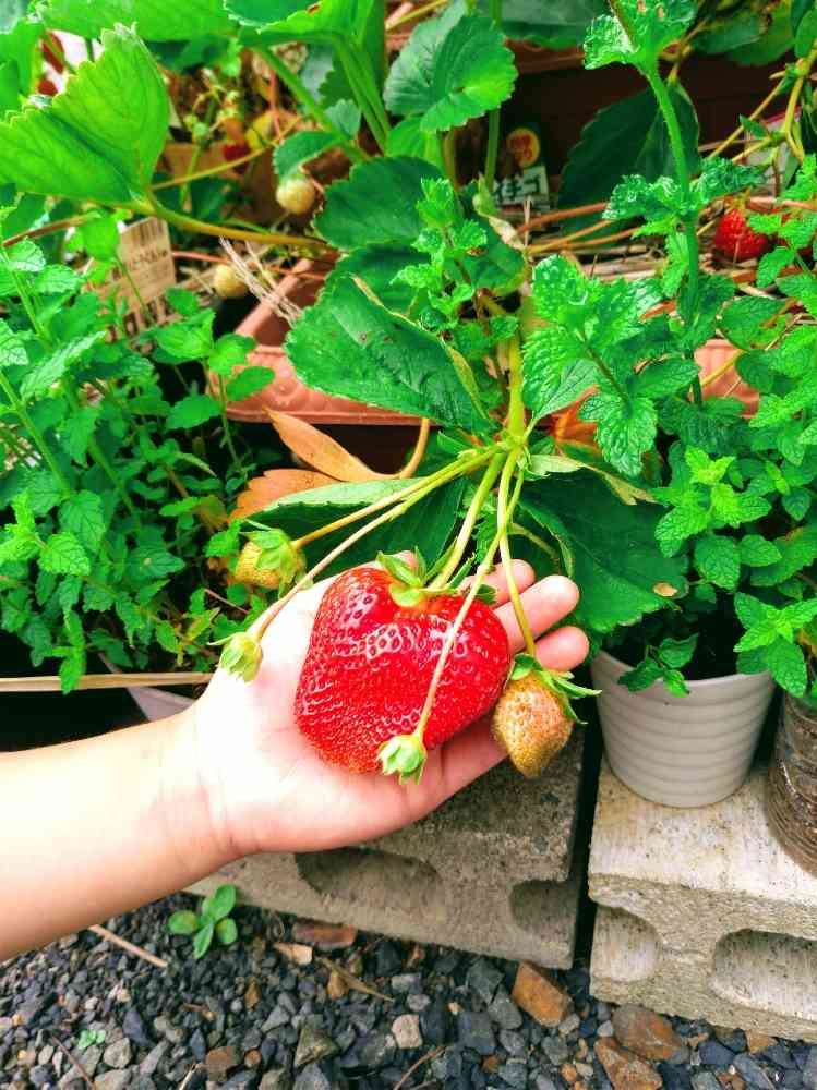 もう終わりかけのイチゴちゃんたちが頑張っております!🍓✨ナメクジにもやられてない奇跡的なひと粒✨7、8cmあります\( •̀ω•́ )/
