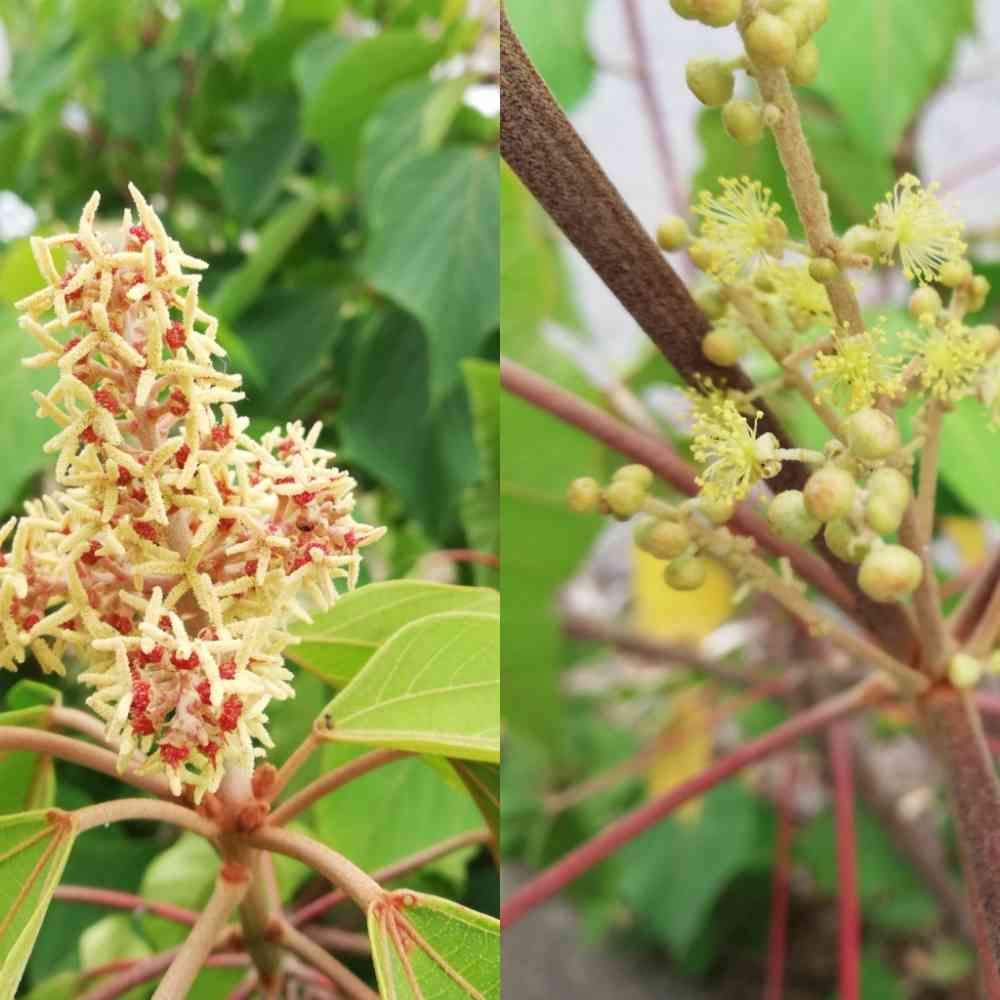 習い事の帰り、コンビニに寄ったら、アカメガシワに赤い色が目立っていて、花を見つけました。以外と派手な色で可愛いですね。 雄花と雌花でこんなに、花が違うのかとビックリしました。 葉っぱは同じようなのに😄