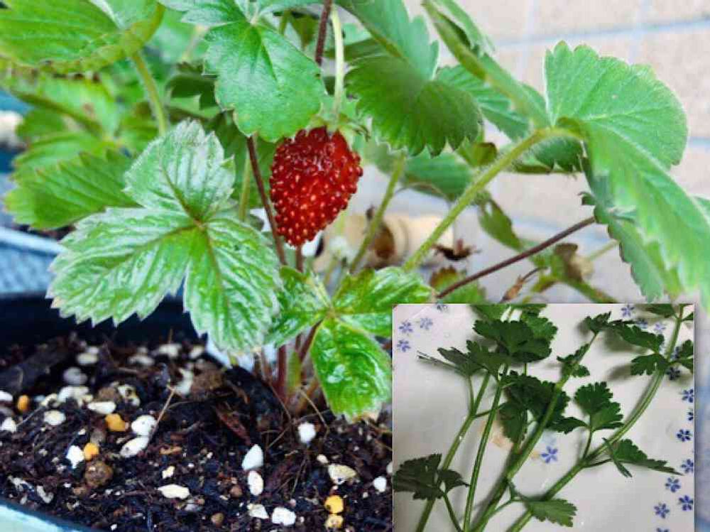 写真は赤くなったルーゲンストロベリー🍓と、収穫したリーフレタス🥬
