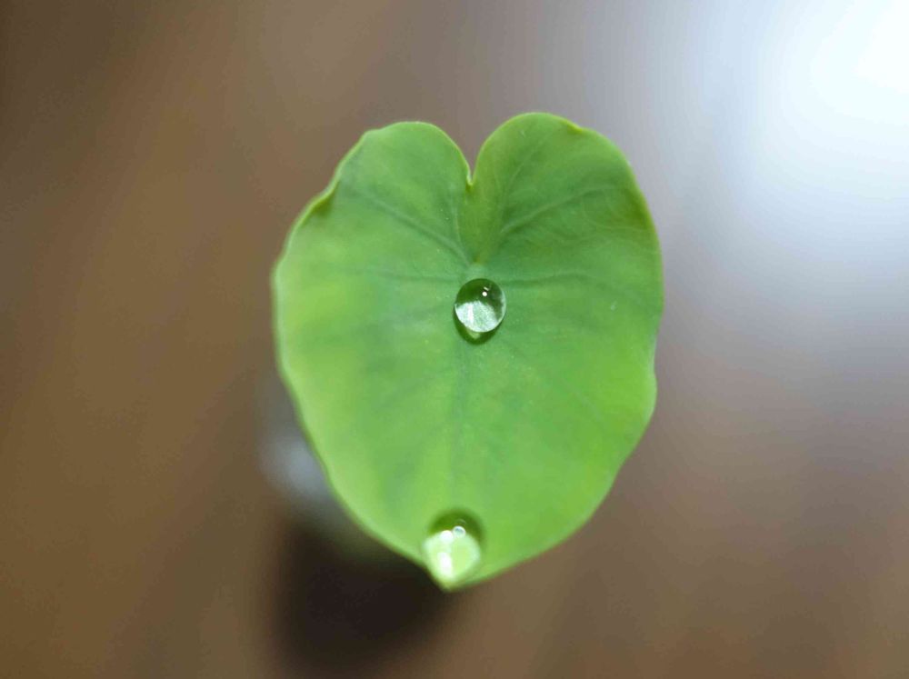サトイモって、葉っぱの先から雫が出てくるんですね。