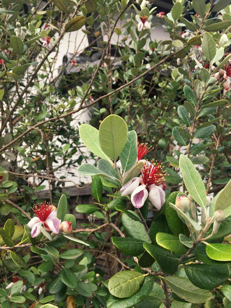 夏にはパイナップルグァバの名前で流通する果実を実らせ、ジャムやスムージー、果実酒などに利用されています。パイナップルに似た香りを放ち、パイナップルやりんご、いちごを混ぜたような甘い味が特徴です。