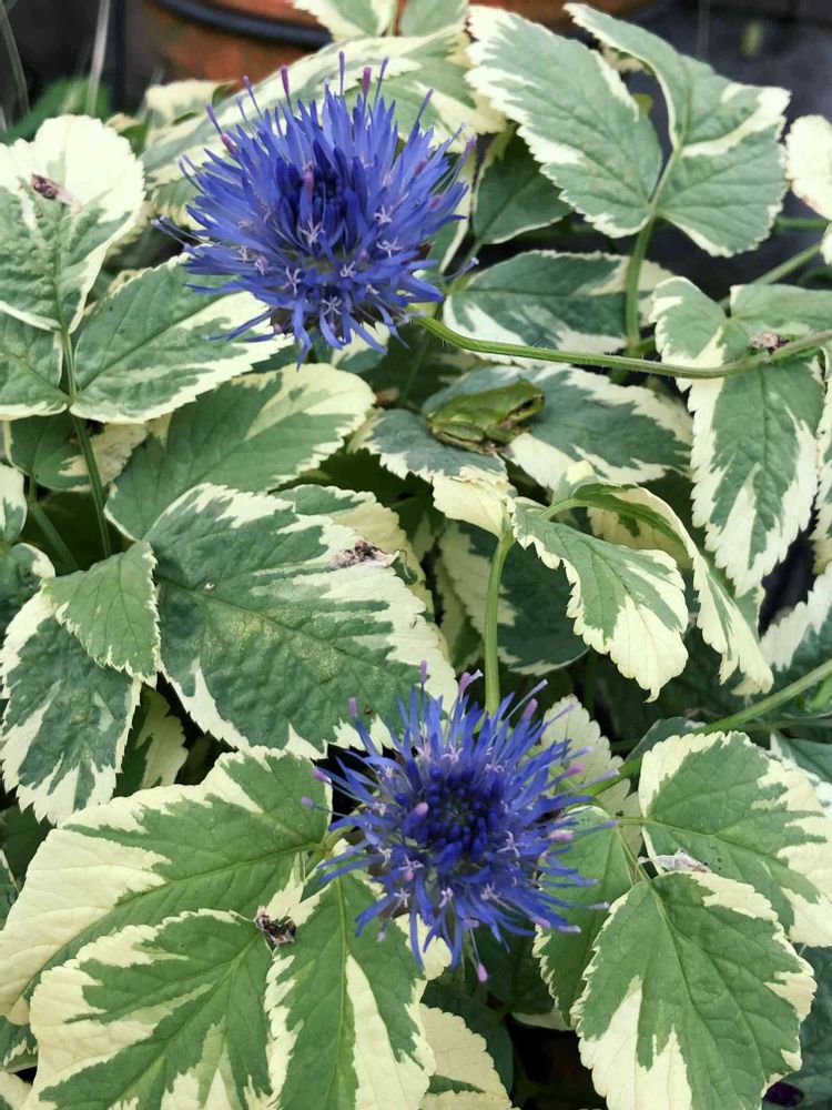 ヤシオネブルーライトと、葉っぱはエゴポディウム🍀プラス🐸かえるくん💕