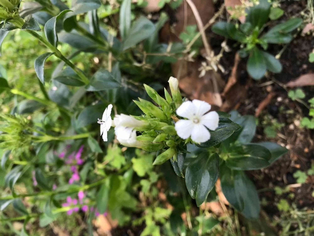 濃い葉の色に、白の花弁5枚雄しべ雌しべは薄紫がかっていました。