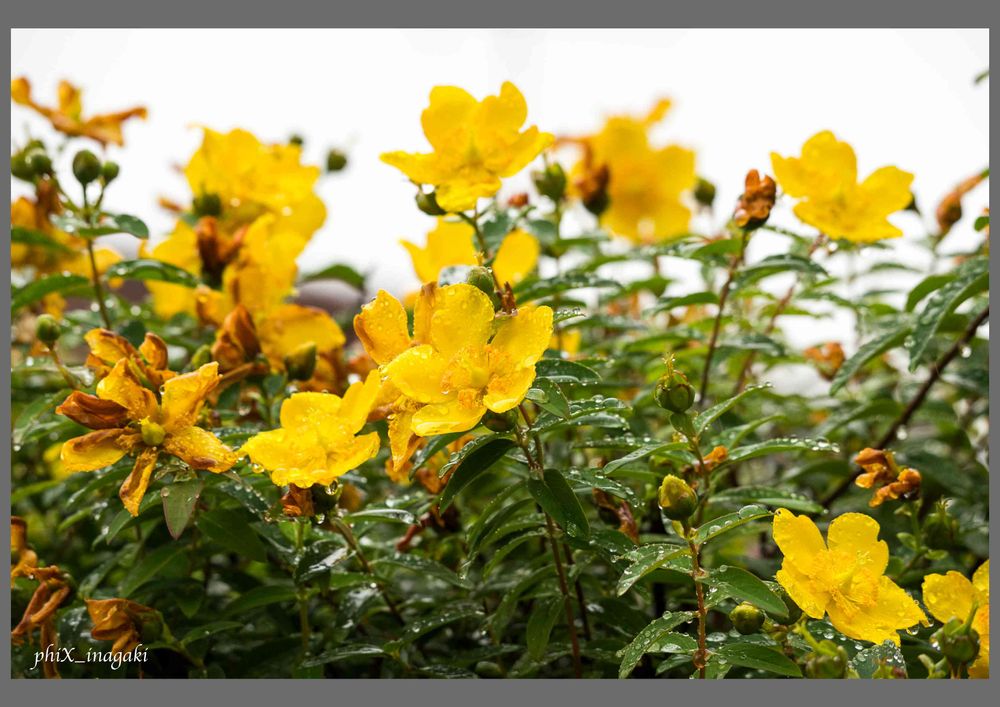 街歩きで見た,キンシバイの花。黄色が濃くて綺麗でした。雨に濡れています。はじめはビヨウヤナギだと思って撮っていたのですが,家に帰って比べたら蘂の付き方が大分違っていました。記憶って曖昧ですね。