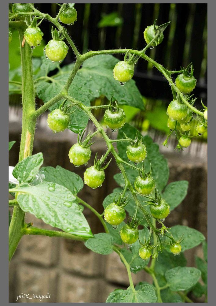 街歩きのあるお宅の庭先で,ミニトマトの若い実が沢山付いていてかわいかったので,撮って見ました。雨つぶが乗っています,大きくなると良いなあ。