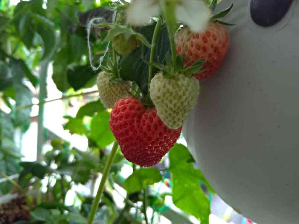 大きな違いは、株の種類。今回のは紅ほっぺ、ハンギングバックは栃乙女。容器も広く浅いのが釣り鉢であること。この辺の差が大きいのかもしれません。