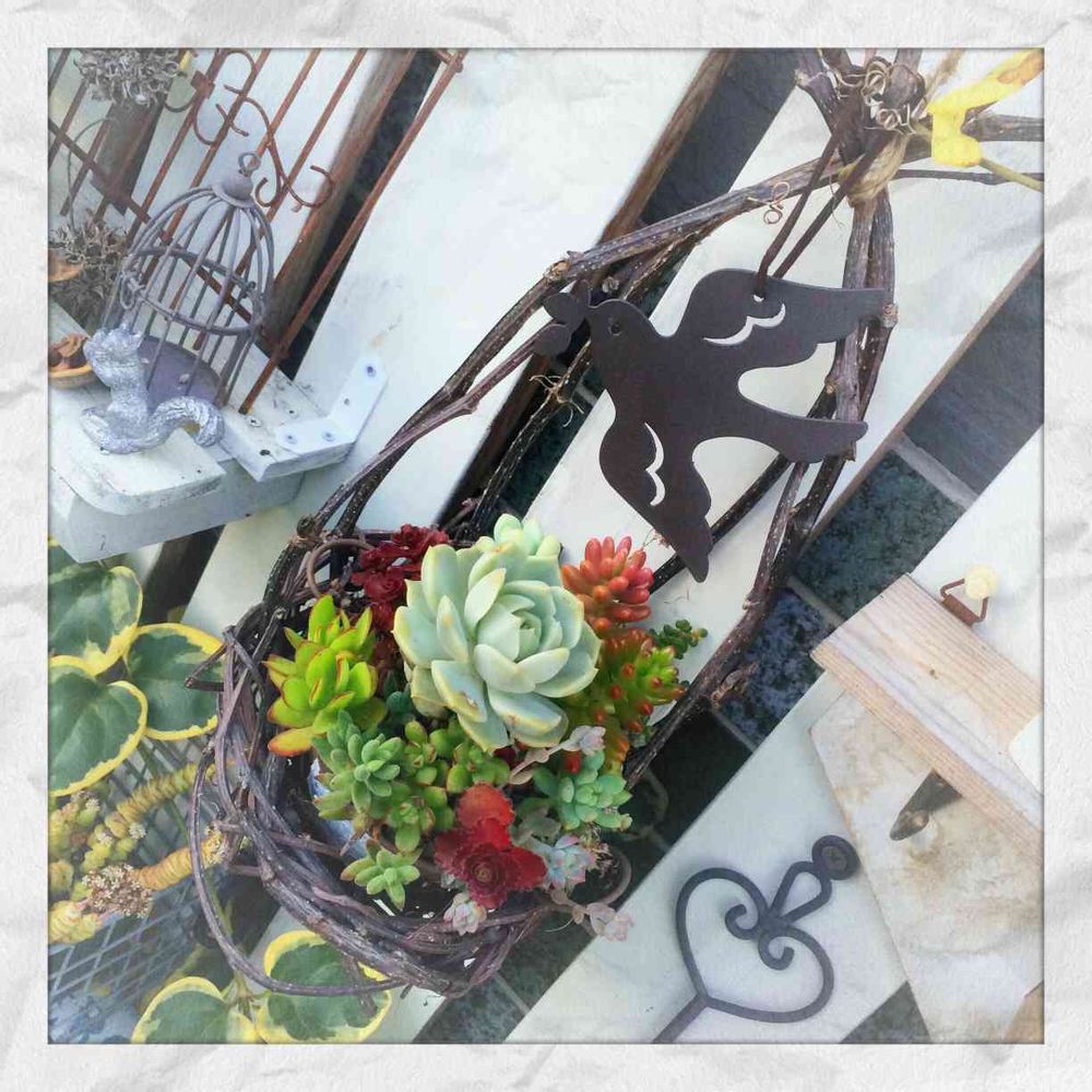 ヘンリーヅタで鳥かご風に作ったカゴに多肉ちゃん寄せ♡*゜ハンキング♬