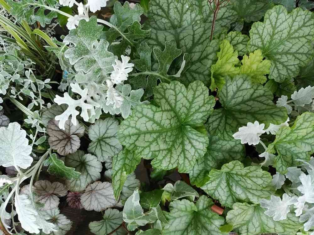 ヒューケラ、ハツユキカズラ、シュガーパイン、葉ものが大好きです💕あまり日の当たらないベランダで葉物中心です🌿