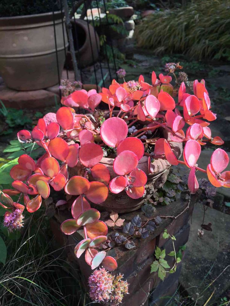 秋の庭仕事。ミセバヤが珊瑚色に色付いてました!