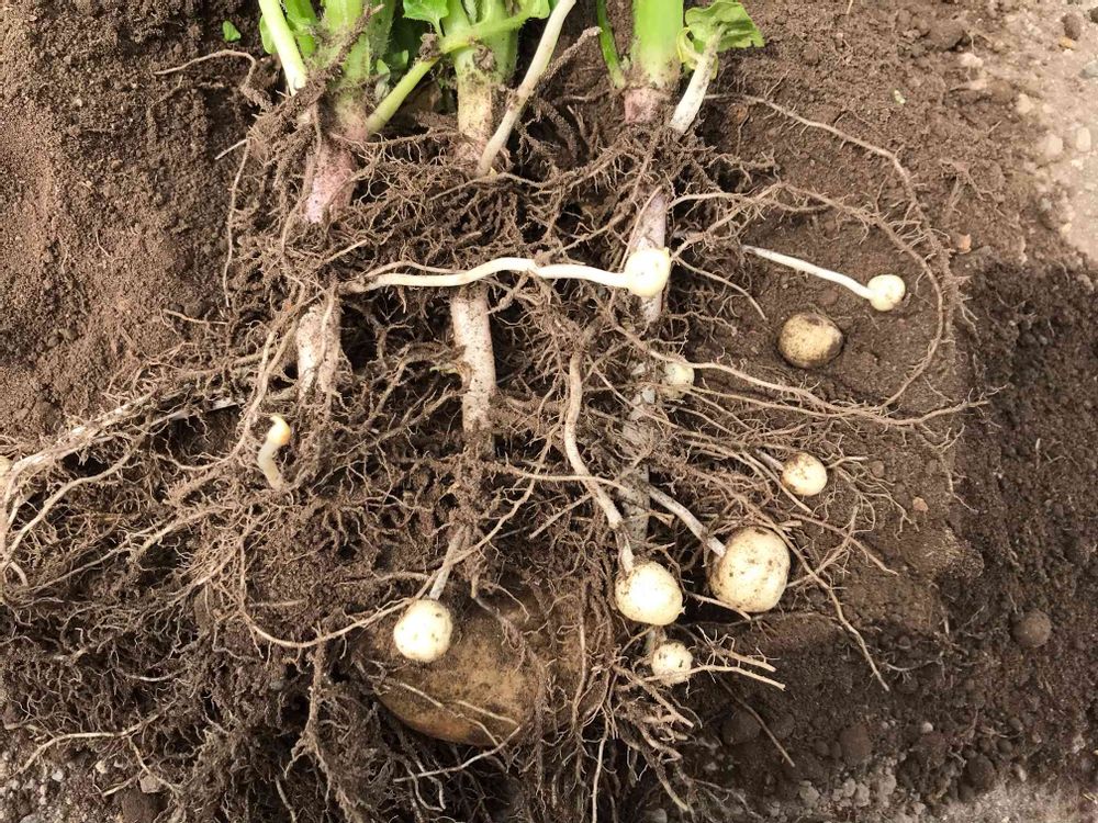 植えてすぐの早期培土なので白い地下茎が長く芋が分散して着いてるので大きさが揃った芋になるはずです!ハズです😅