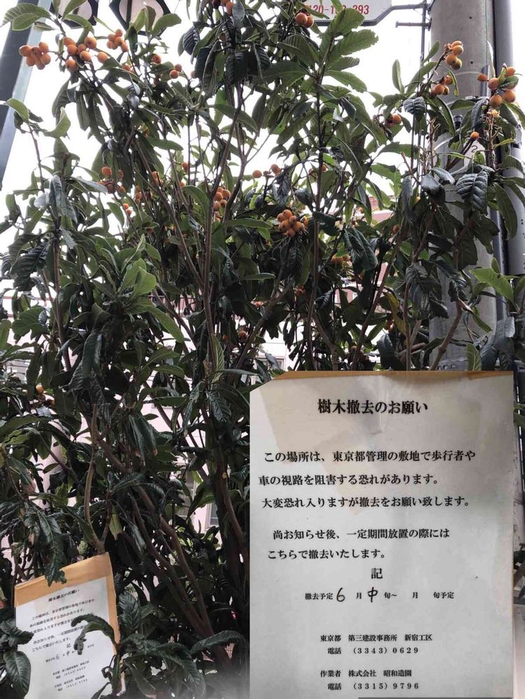 これはよく見ると👀車道側の歩道で、電柱の側なのですが、ビワが美味しそうなオレンジ色をしています。