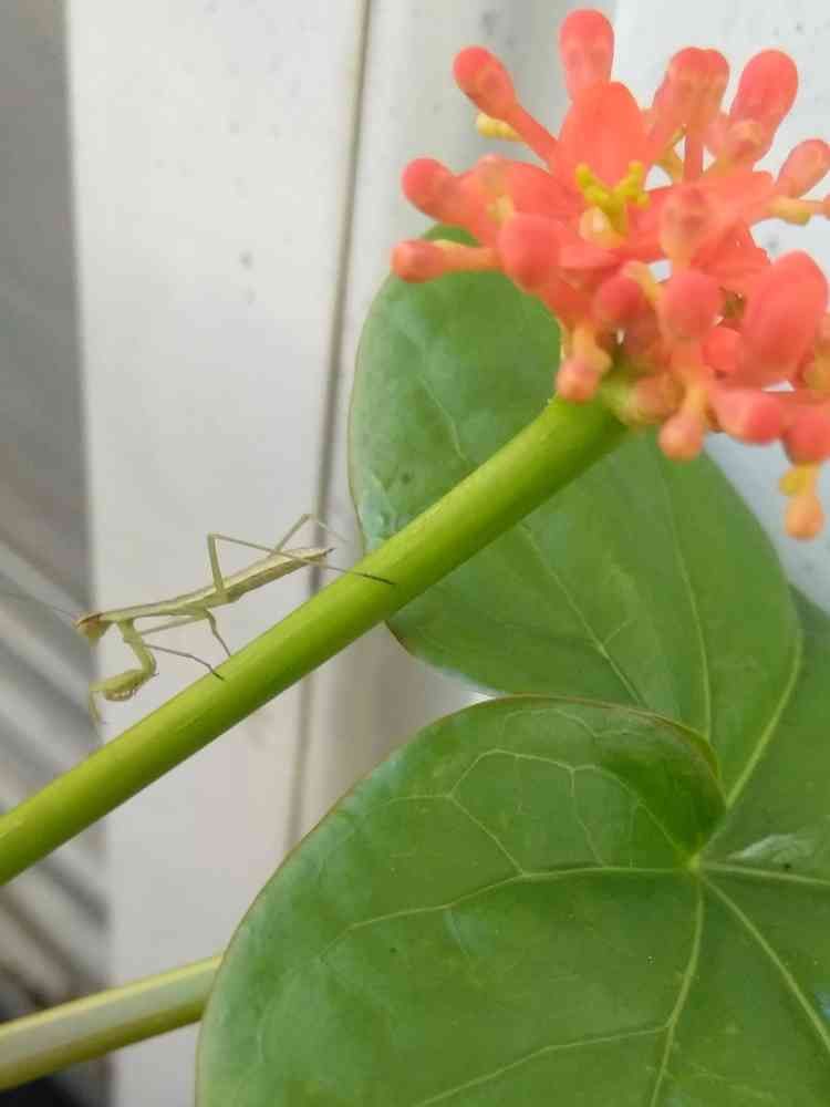 ミニ珊瑚油桐のくきにカマキリの子供発見。ムクドリに見つからずに、大きくなあれ⁉️