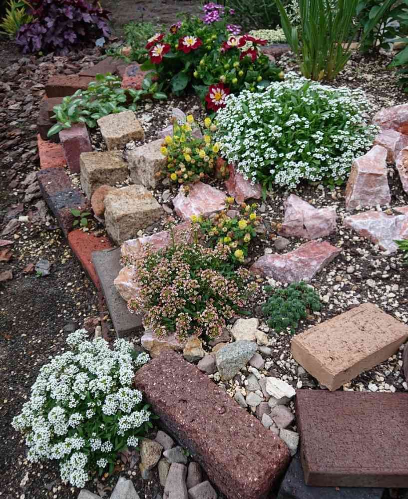 岩崩れに流れる小花の滝をイメージして植えたアリッサムとトリフォリウムとアンドロサセ