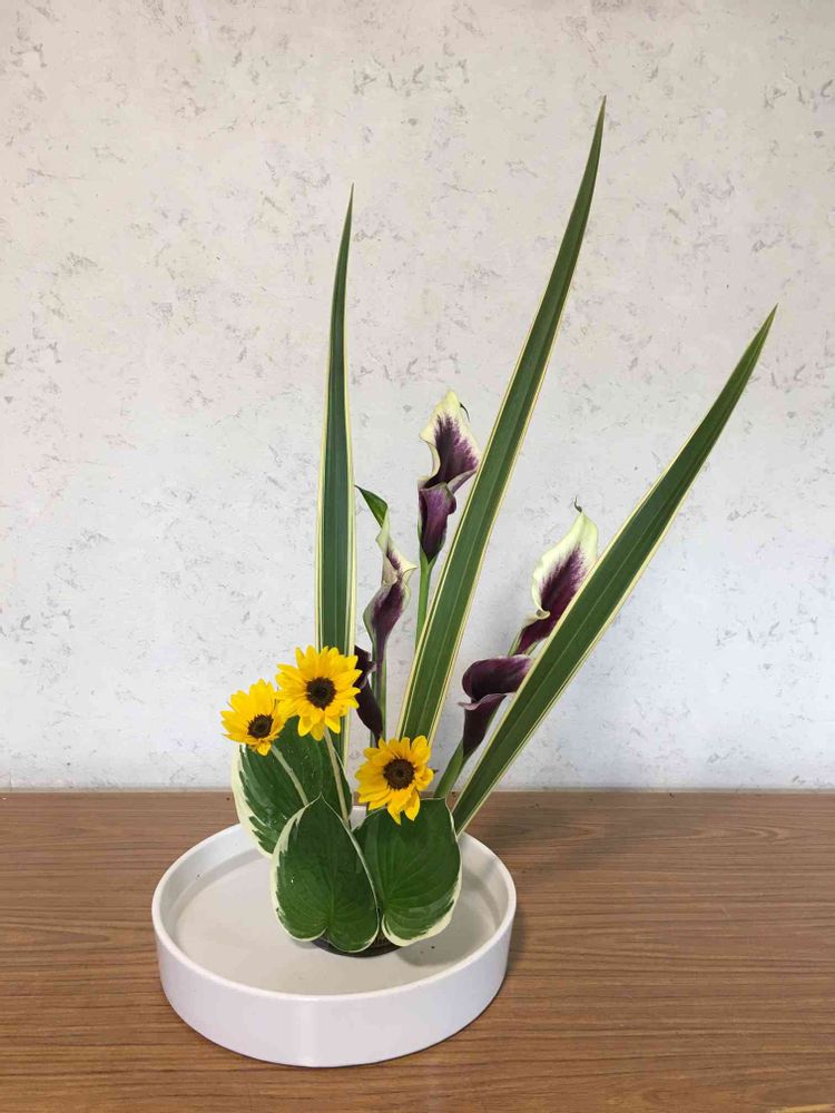 今回の花材、カラー、ヒマワリ、ニューサイラン、ギボウシ