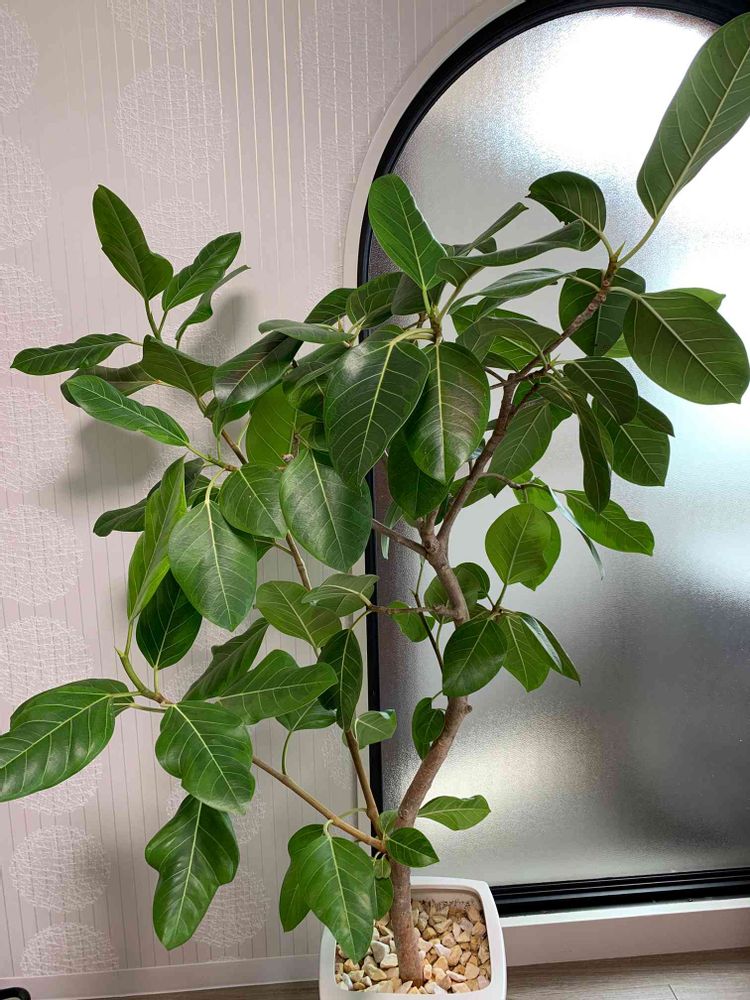 1年半で伸び伸びになってしまったゴムの木⋯うちの子になった当初はメインの幹(右側)しかなかったんですが。どこを剪定したら良いのやら⋯。せめて葉っぱを間引くべきでしょうか〜
