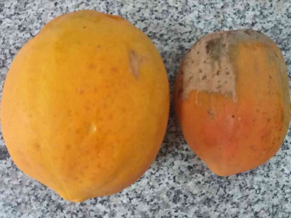 今朝収穫のパパイヤ。木熟もこれがギリギリくらい。