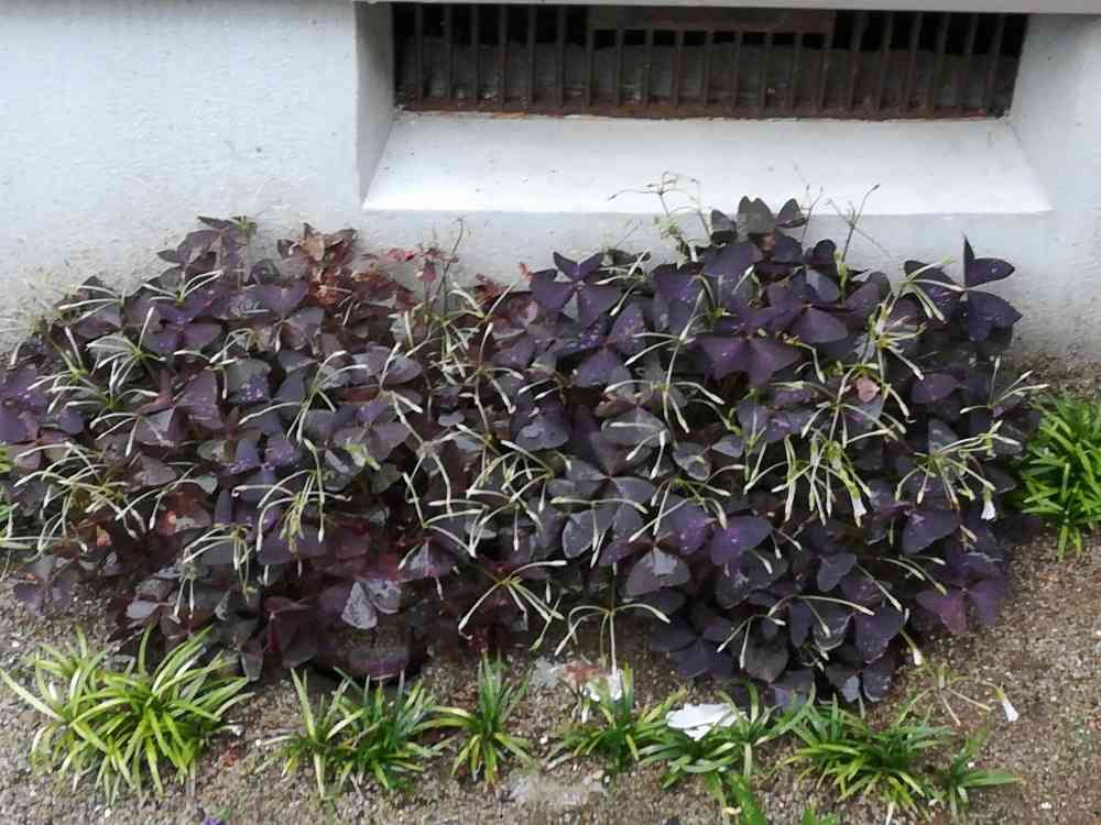 奥の紫色の植物です。葉の形はハート型で三つ葉のクローバーの様に付いています。