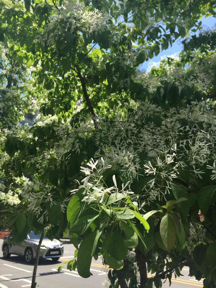 お出かけ先で見つけた街路樹。白い花が咲いてました。なんて名前の木なのかしら。