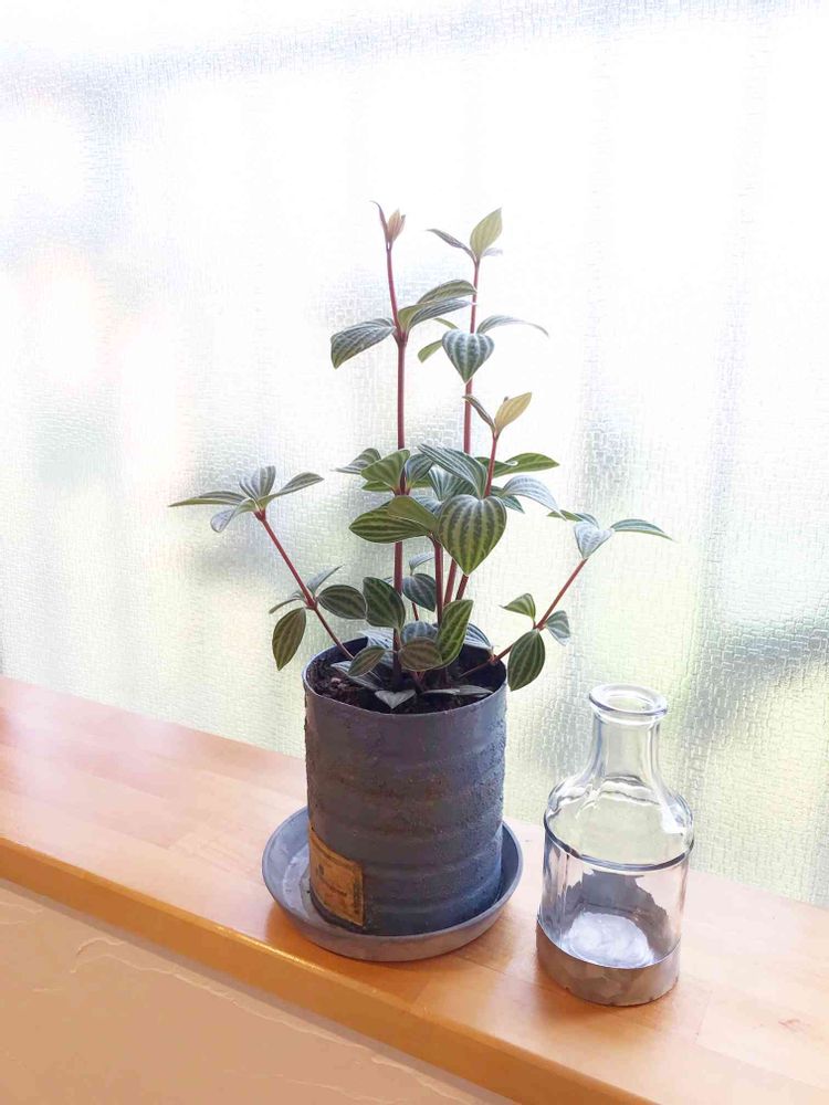 ペペロミアプテオラータは鉢を変えて室内の窓辺へ。少しバランスが悪いから、この植物にあう鉢を考えなきゃな。