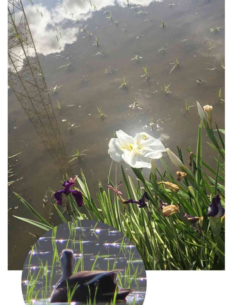 お出かけ先,ハナショウブ,水田に映る空と雲の投稿画像