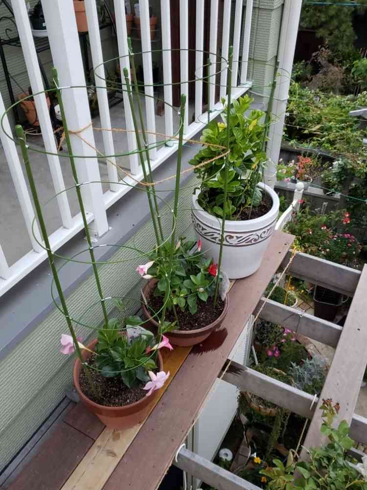 朝台風シーズンになったらどうするのだ、と思いながら、置く場所がないので、第三パーゴラにマンデビラ三鉢を置きました。