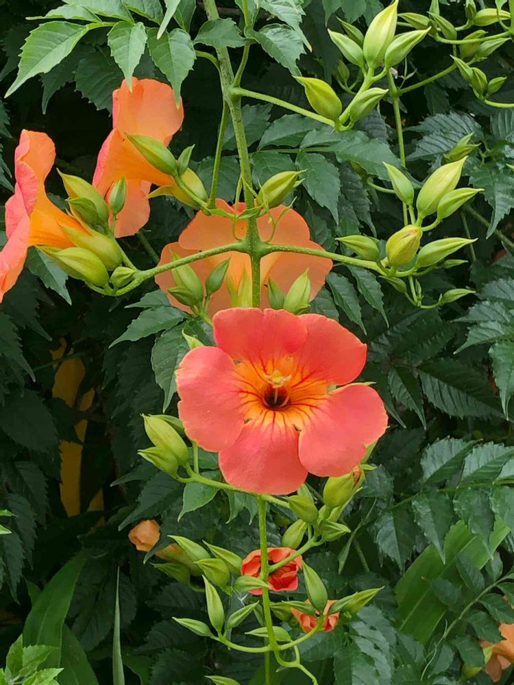 ノウゼンカズラ大ー好きです。特にこの明るいオレンジ色が南国風で「夏が来る!」って気持ちになります🧡!我が家のお庭にもあるのですが、支柱にしていた木が倒れてしまい、今、困った状態なのです~😆。