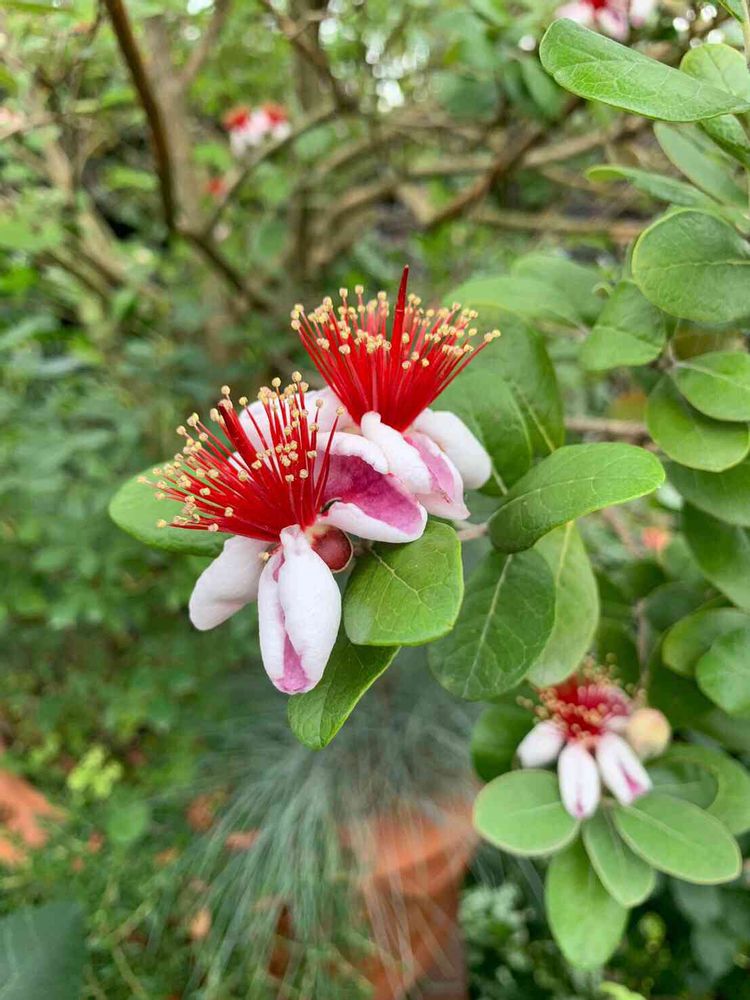エディブルフラワーとして食用にも利用できるそうですが、果実は、別名パイナップルグアバと呼ばれ、パイナップルとバナナとリンゴを混ぜたような味で甘い香りを漂わせるそうです❤️