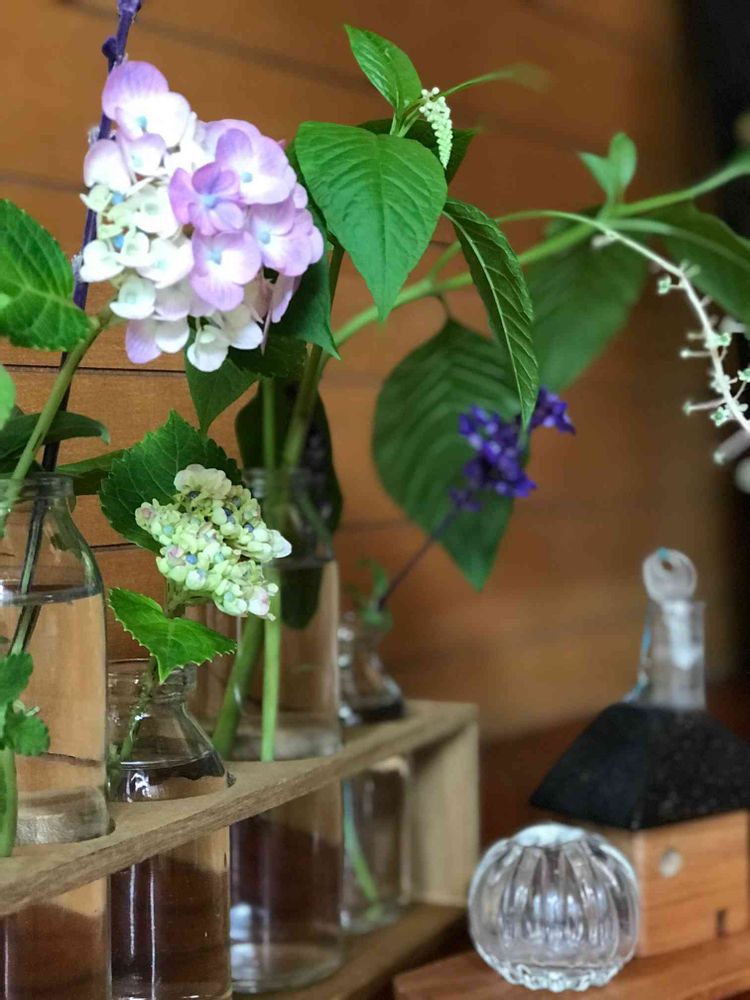 実は5連なんです。紫陽花と、ブルーサルビアと、ミントと、ヨウシュヤマゴボウを挿してみました。