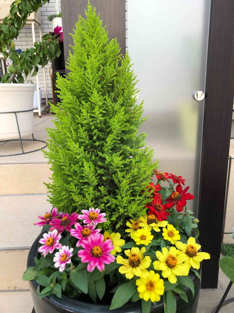 この木なんだったかな💦引っ越して来てからだから3年目。前の鉢だと鉢底に根がぐるぐるとぐろを巻いていたので大きな鉢に植え替え。隙間に一目惚れしたジニアを色違いで3株うえてみました💖ジニアかわいい