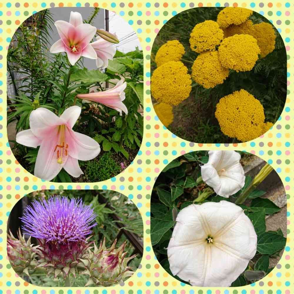 ユリ、キバナノコギリソウ、アザミ、エンゼルトランペット🎺