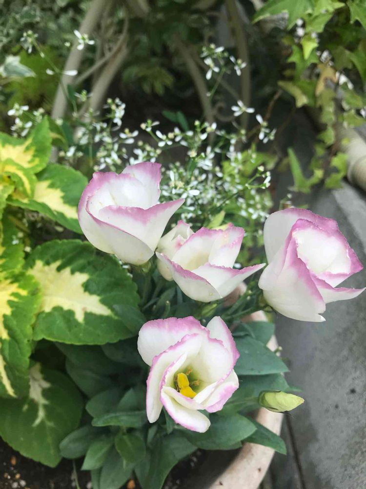 トルコキキョウ寄せ植えてみました。繊細な花だけど意外に花もち良さそうです。