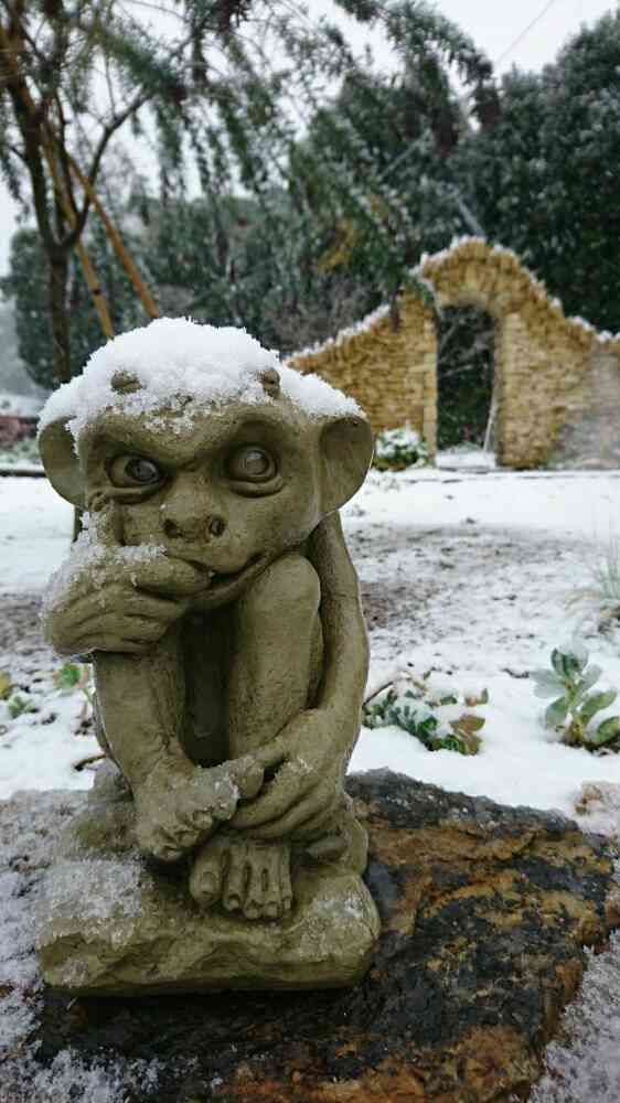 我が家のお庭の番人、グレムリンくんも寒そう😖