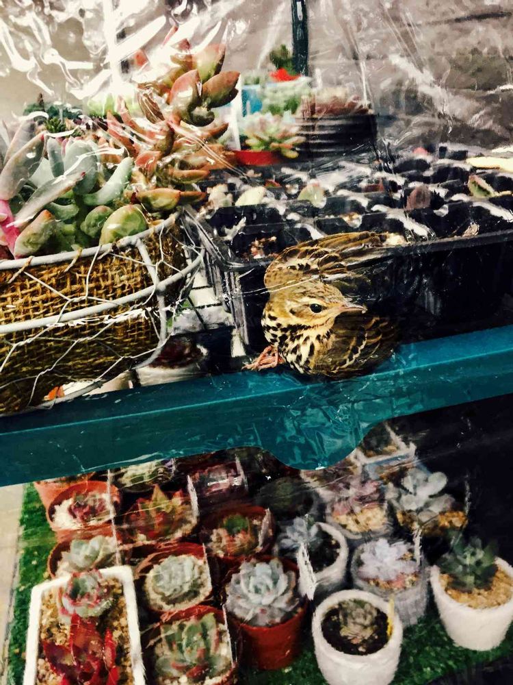 雪が酷くなってきて心配だったので多肉温室を確認しにいったら、小鳥がっ!?