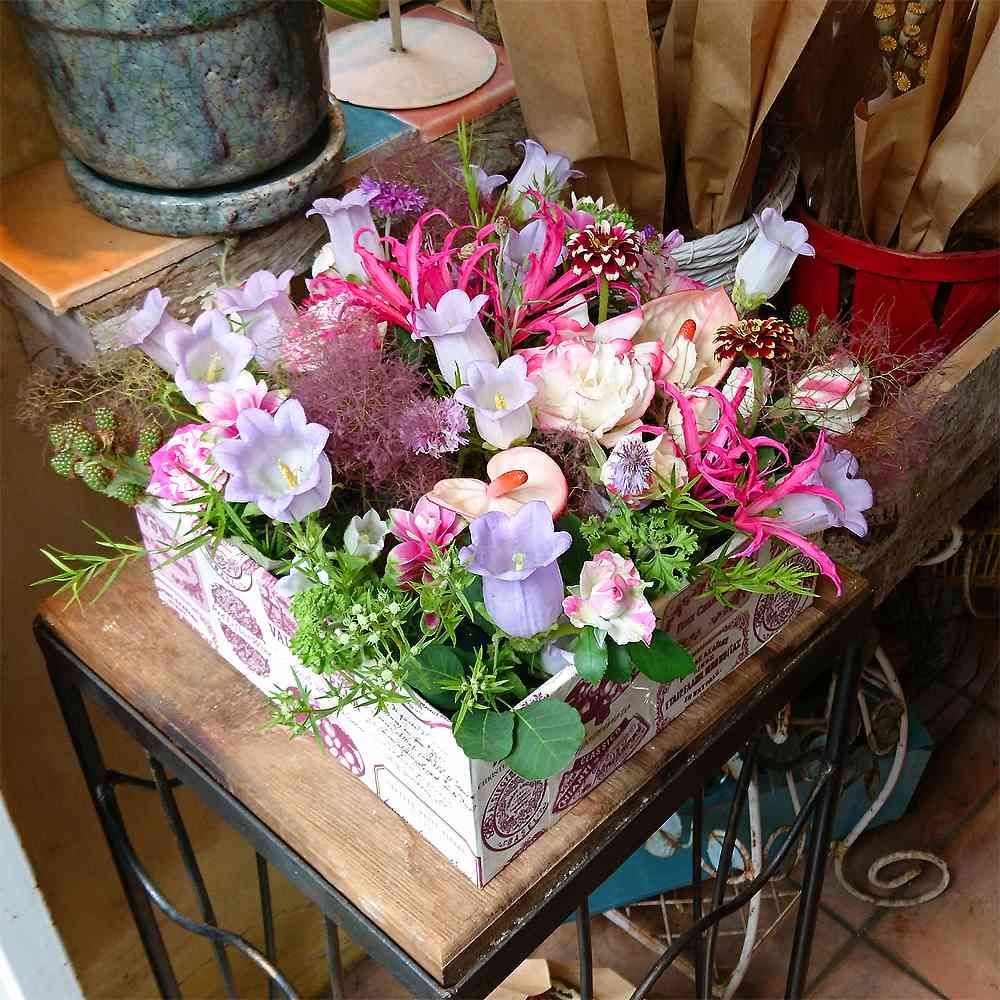 先日のフラワースクールでの作品。テーマは「花のためにコーディネイトする器のデザイン」。お洒落なペーパーを切り貼りして作りました。お花は、カンパニュラやアンスリウム、スモークツリーなどなど。