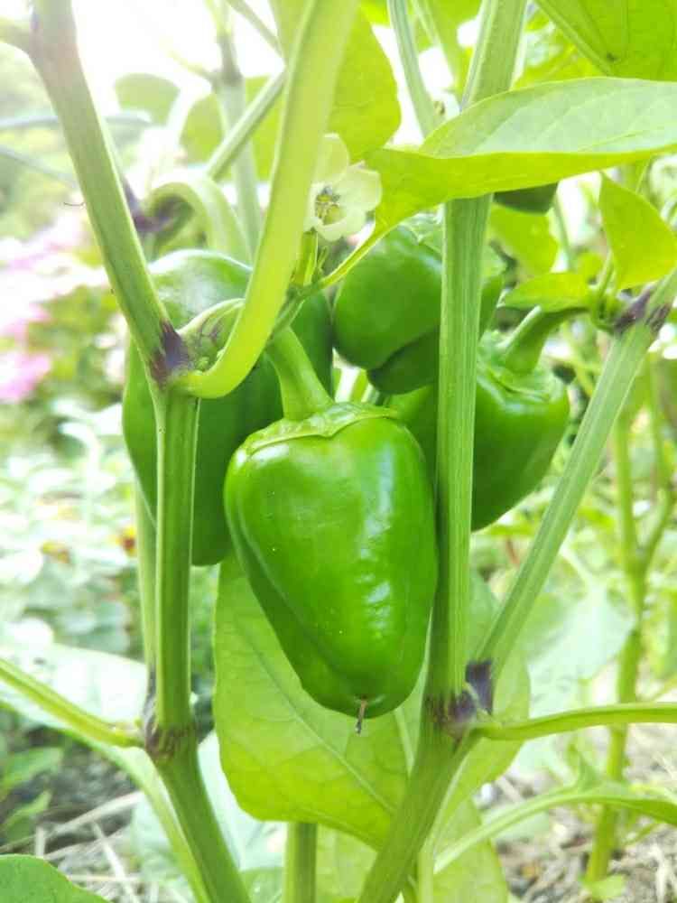 パプリカ花が咲いたら~🎵子供が歌ってるのを聴いて植えてみたパプリカにも実がなってる❗️色づくのはまだまだ先かな~