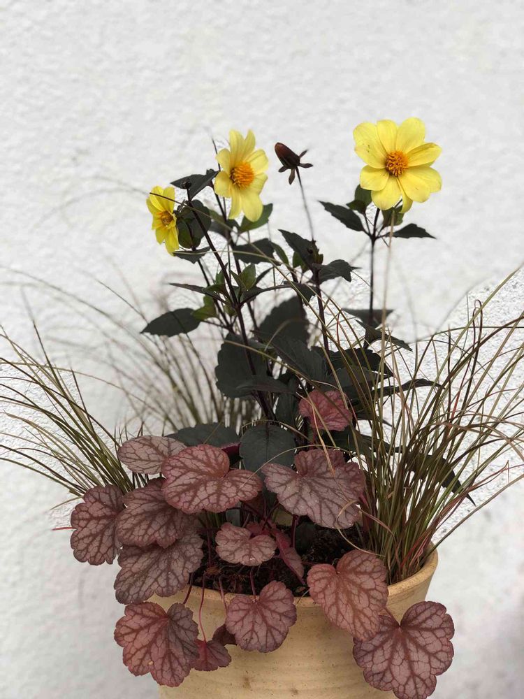 銅葉が綺麗なダリアと、ヒューケラとカレックス