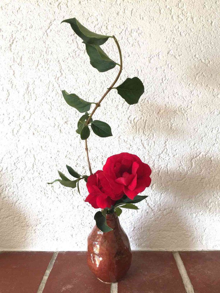 レンギョウと薔薇を長男の作った瓶に生けました。