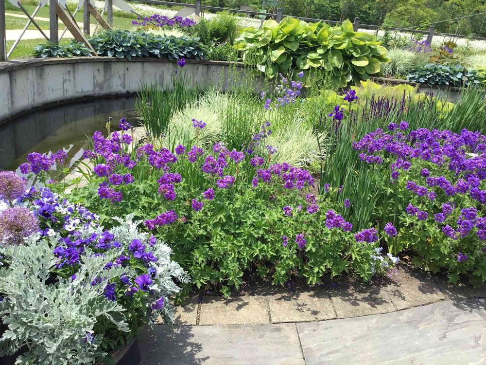 巨大なホスタ、ブルー系の宿根が水辺によく合います。水生植物が育った頃が見頃かな。
