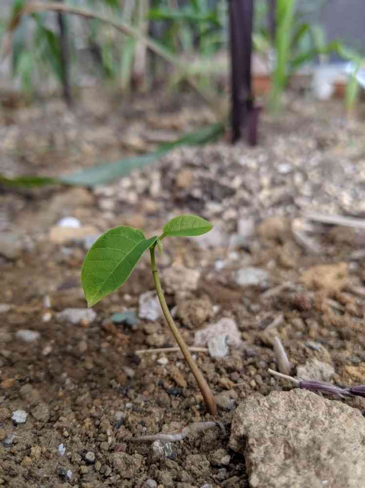 余ったアテモヤの種をてきとうに撒いたら芽が出ていました。
