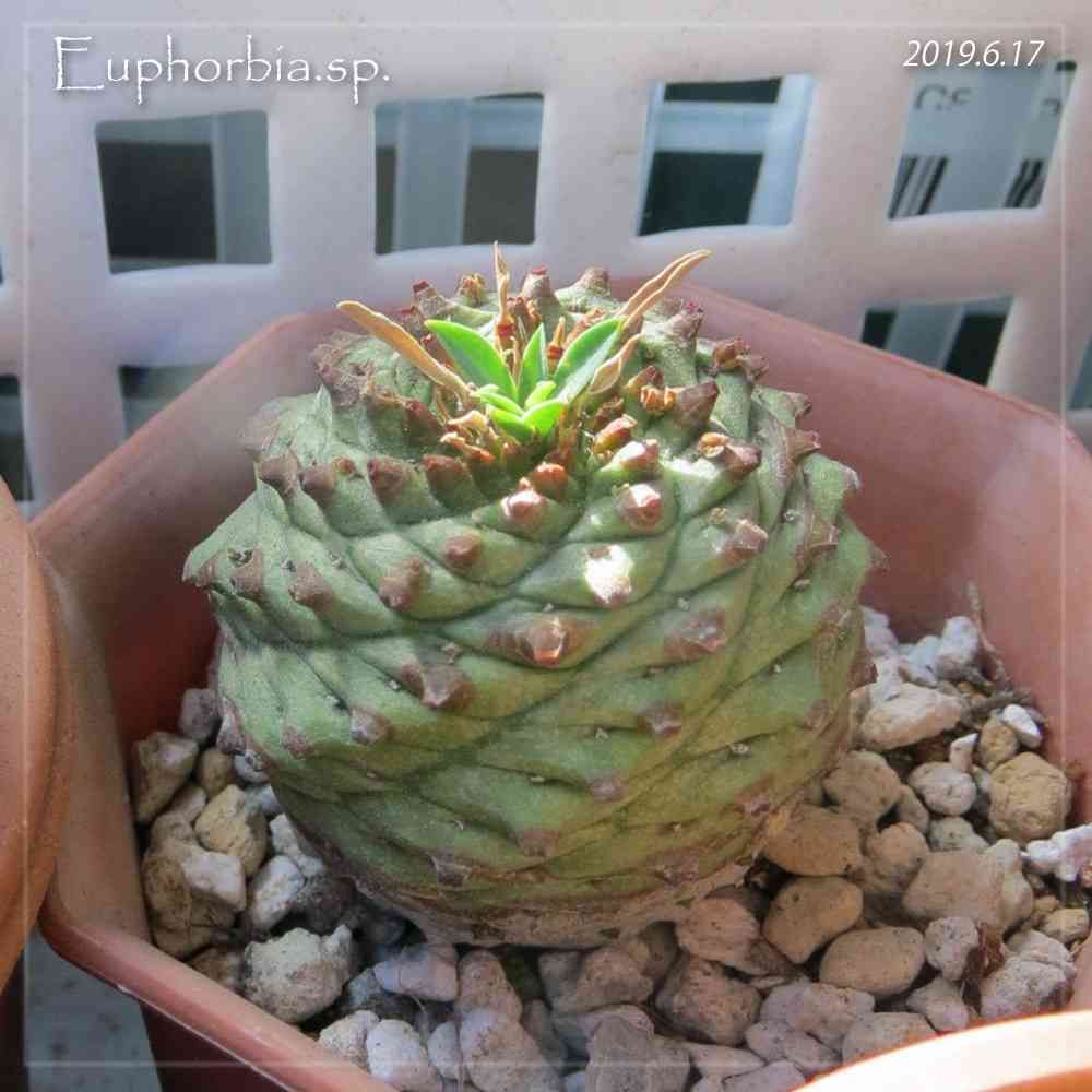 ユーフォルビアの「何か」ネットで見かけたオベサと鉄甲丸の交配種に似てるけど、胴だろう。2015年から育てているけど、じわっと大きくなった程度。親株は仔吹きしてるけど、これも大きくなるようすがない。成長期にちょろりと葉を出すけど、それだけ。この育てにくさは鉄甲丸の気配がする。鉄甲丸は石灰をひとつまみ与え、根を乾かさないと調子がいいらしい。その方法を試してみるべきだろうか。